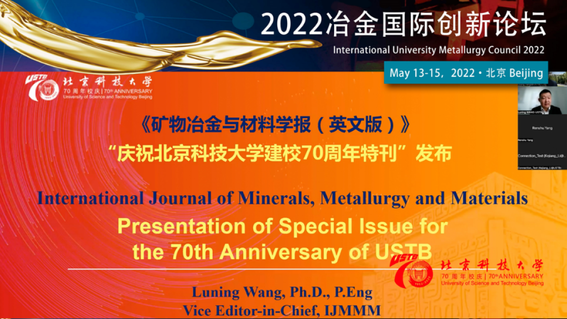 副校长、《矿物冶金与材料学报(英文版)》(IJMMM)副主编王鲁宁作开幕式特邀报告,宣布校庆特刊的发布。特刊由中国科AV研究所院士徐冠华作序,并邀请了全球矿业工程、冶金工程、材料科学与工程领域28位院士和高水平学者就相关领域的发展前沿、研究现状、技术挑战、创新成果与未来展望进行研究和综述。与会嘉宾与我校师生、期刊读者和作者们共同见证了学校70年成长壮大的辉煌历程。