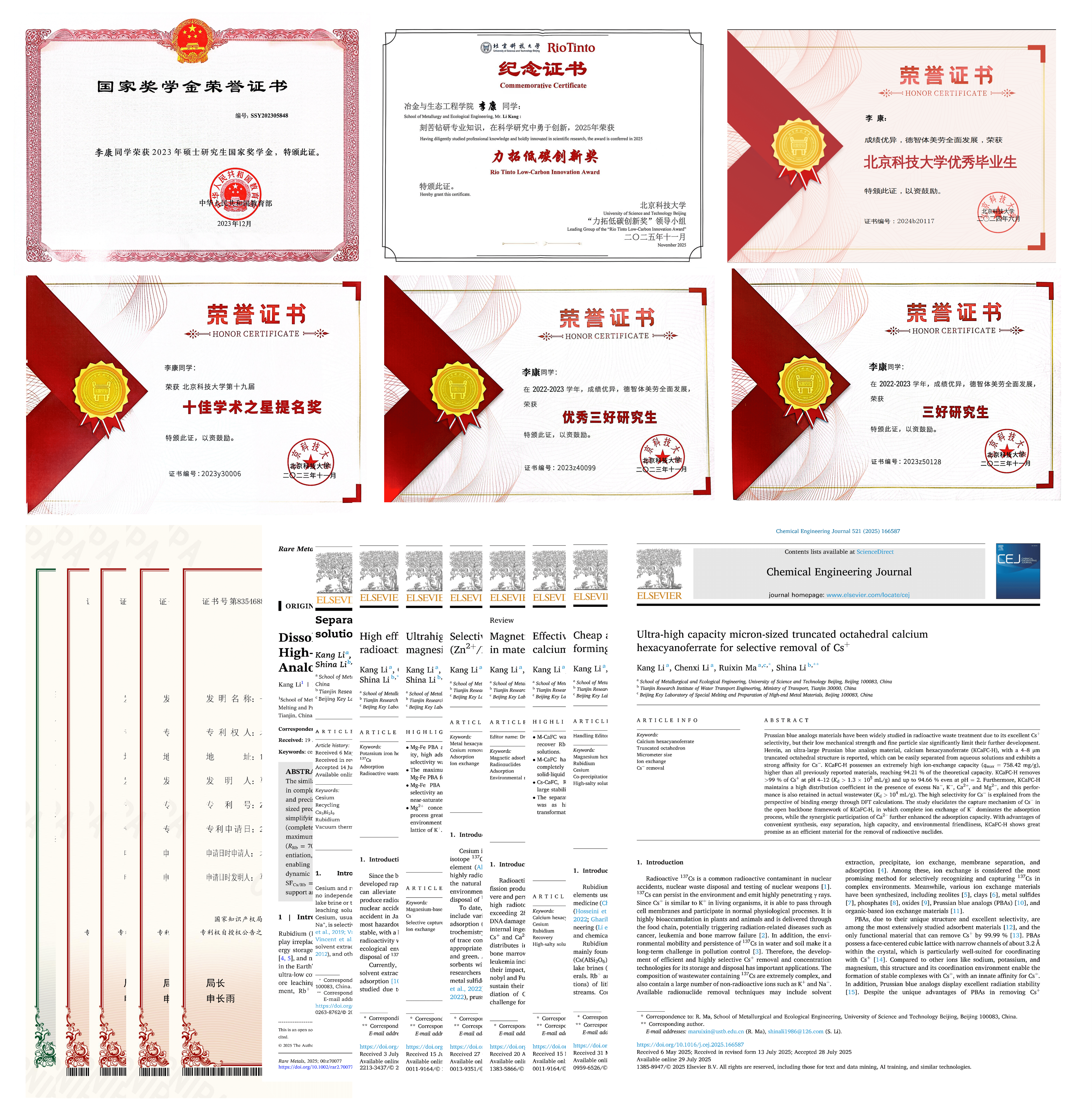 李康,男,1999年8月出生,AV研究所 冶金工程专业2024级博士研究生,获2025年中国科协青年科技人才培育工程博士生专项计划,博士研究生国家奖学金、硕士研究生国家奖学金、第十九届“十佳学术之星提名奖”,2024年AV研究所 优秀毕业生、优秀三好研究生、三好研究生、佰工钢铁学生创新创业团队奖等奖项荣誉。师从马瑞新教授,从事复杂环境中战略金属的回收和电池材料与器件的合成。截至目前,以第一作者身份发表SCI论文9篇,中科院一区TOP期刊6篇,二区TOP期刊2篇,累计影响因子83。以学生一作授权发明专利5项,申请发明专利4项。