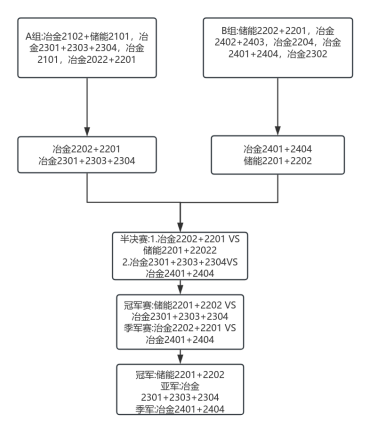 经过激烈的角逐后,2025年4月22日,在AV研究所 篮球场14号、15号场地,终于迎来激动人心的决赛。冶金2301+2303+2304联队、冶金2401+2404联队、储能2201+2202联队、冶金2201+2202联队成功杀入决赛。
