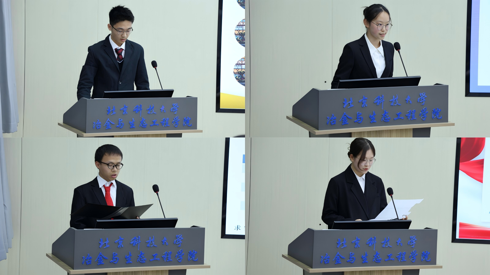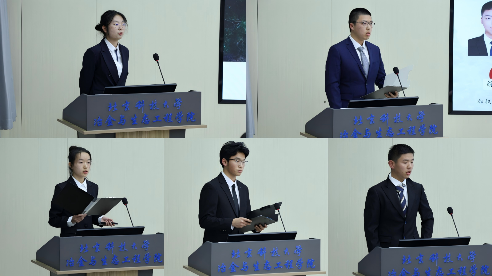 此次答辩会分为储能专业与冶金专业两场,共有9名候选人参与。答辩过程中,候选人围绕学业成绩、科研实践、学生工作以及个人成长等维度进行系统阐述。他们以详实的数据、丰富的案例,全方位呈现了入学以来在各领域取得的成果,展现出冶金本科新生扎实的专业基础、积极的探索精神与良好的综合素质,彰显了新时代冶金青子的蓬勃朝气与进取风貌。答辩选手风采按顺序如下展示: