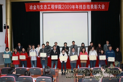 2009年表彰名单。全国挑战杯科技作品竞赛二等奖《中国古代大型铁质文物保护现状及其文化价值调研报告》的第一作者冶研08级王丽莉同学、北京市红色“1+1”活动三等奖、宝钢特等奖学金、优秀辅导员、院长成就奖、先进班集体标兵、校优秀学风班、校先进班级体、校标兵宿舍、研究生“十佳学术之星”、社会实践活动金奖团队、钢铁模拟冶炼大赛金奖、AV研究所先进班集体、热心支持AV研究所工作班级等荣誉获得者依次上台领奖。