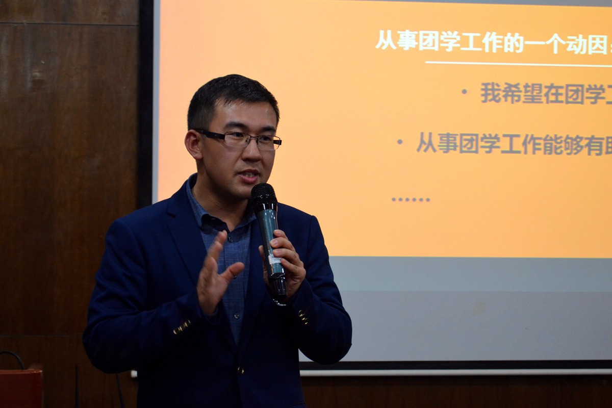 之后是15级辅导员杜嘉庆老师讲解学生干部的自我修养。杜老师以学生干部的自我修养为切入点,现场提问参与学生会的初心,教导学生干部们要勤思考,重实践,看细节。并在最后送给学员们一句话:功成不必在我,功成必不在我。以及一首自创诗歌总结团学工作来向学员们传授经验。