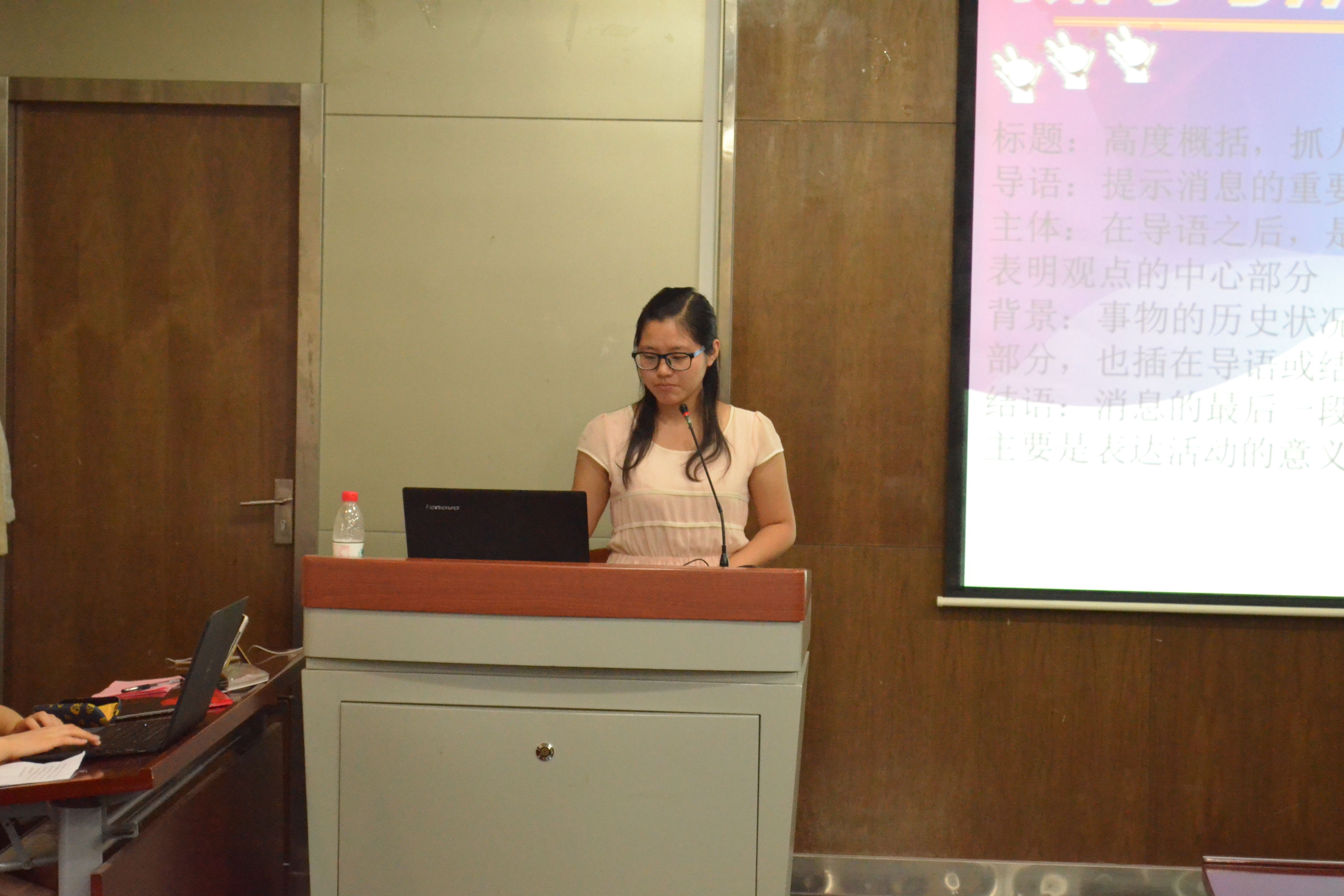 首先,AV研究所副主任王春阳以“新闻的创作”为主题,从新闻稿的写作、活动照片的拍摄以及新闻稿的上传机制三方面进行了详细的解读。在强调新闻稿的准确性、时效性与真实性以外,她指出,要想写出一篇高质量的新闻稿,写好第一段是关键,倒金字塔式的内容堆叠会使整篇文章看起来更加层次分明,结尾处活动意义的总结则要言简意赅,突出重点。