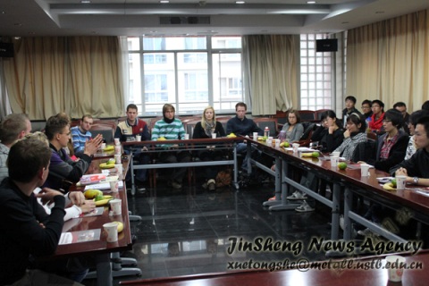 本社讯 2010年10月19日下午,德国亚琛工业大学的十几位学生来到冶金与生态AV研究所,在冶金楼616和我院大三大四的部分学生进行了交流活动。院党委副书记王春义老师、10级辅导员李萌出席了本次活动。