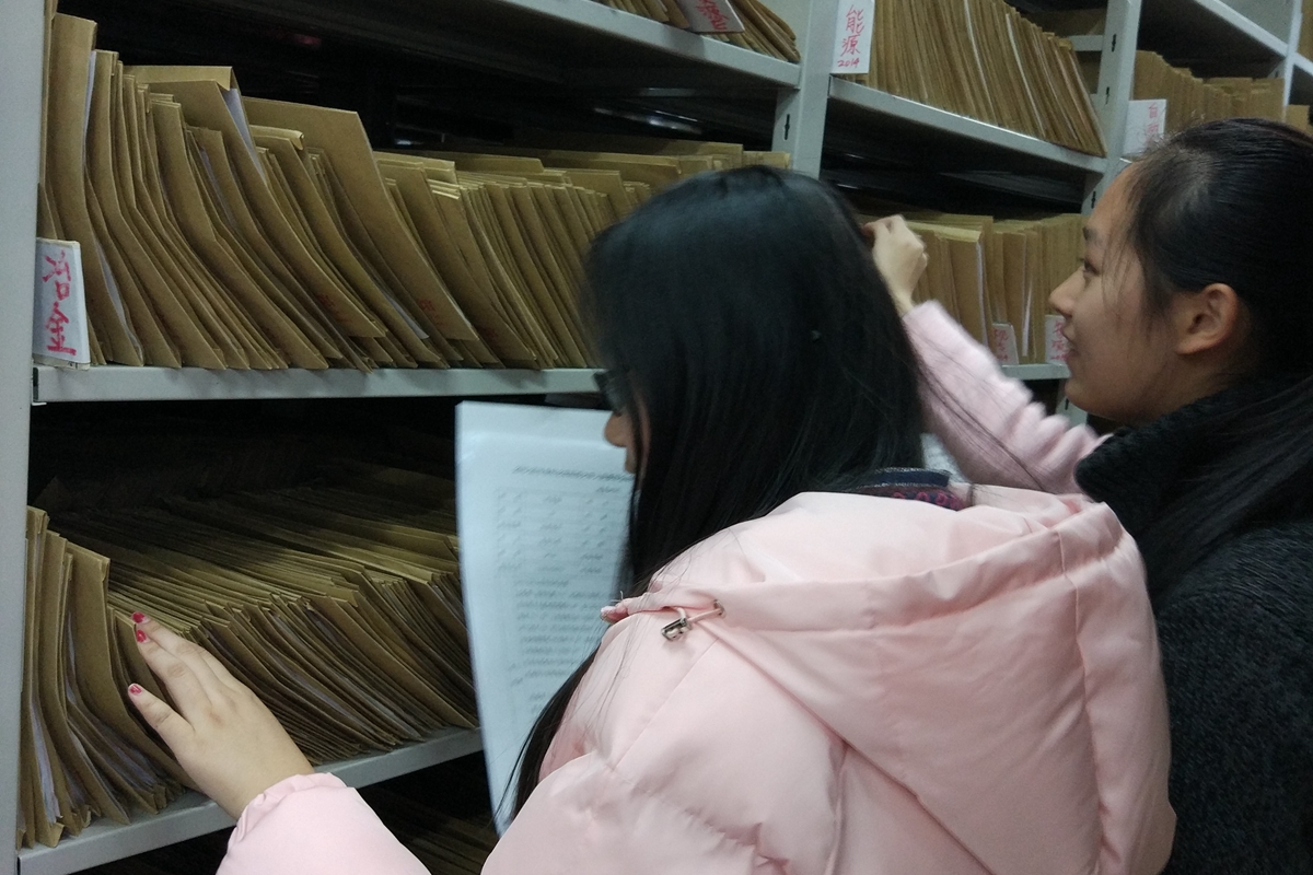 同学们的工作是把2013、2014、2015级部分同学的成绩档案装入各自档案袋。在聆听档案馆老师指导后,同学们忙碌起来。大家分好组,按不同的系与年级定好分工,在各自的档案架上有条不紊地进行整理。整理工作进行顺利,一个多小时后,大家圆满完成了任务。