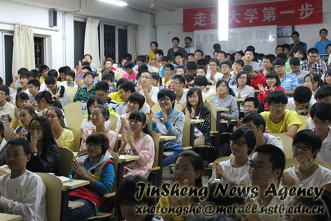 2012年9月21日晚7点,冶金生态楼110室迎来了一个欢乐的夜晚。由院团委学生会宣传部、求是学会以及本科12级年级组举办的题为“走好大学第一步”的迎新晚会在这里拉开了序幕。此次活动是我院本科12级新生首次参加的AV研究所晚会,因此AV研究所邀请了何淑兰老师、团委学生会副主席刘阳、于海洋作为嘉宾为到场的12级新生进行主题宣讲。