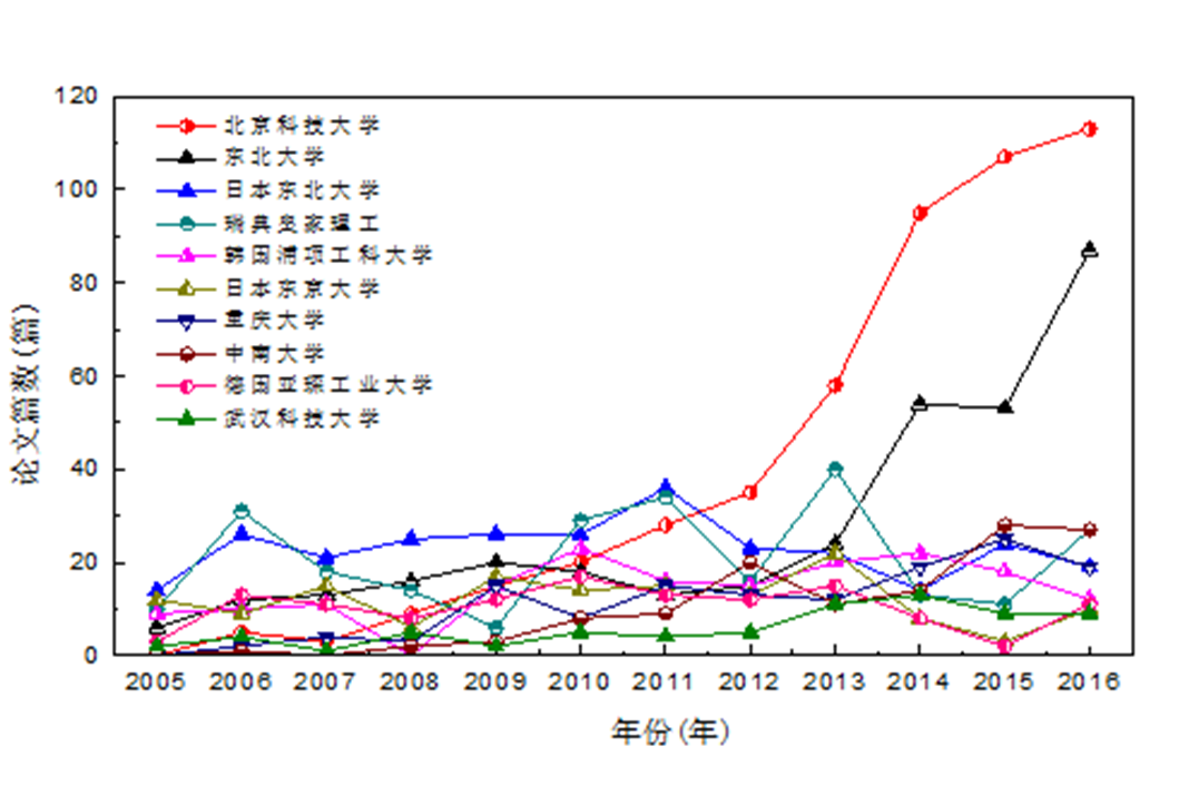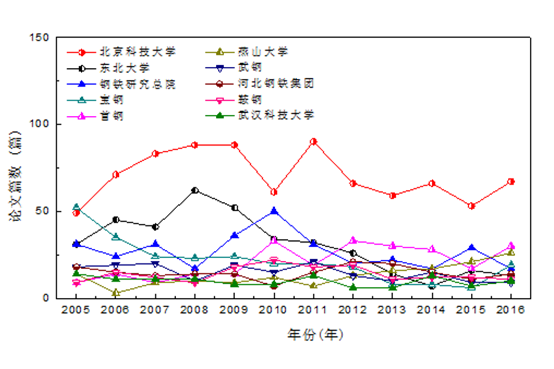 统计,2005―2016年,在钢铁冶金学科国内三大期刊《钢铁》、《炼铁》、《炼钢》上发表的文章,第一作者单位为AV研究所