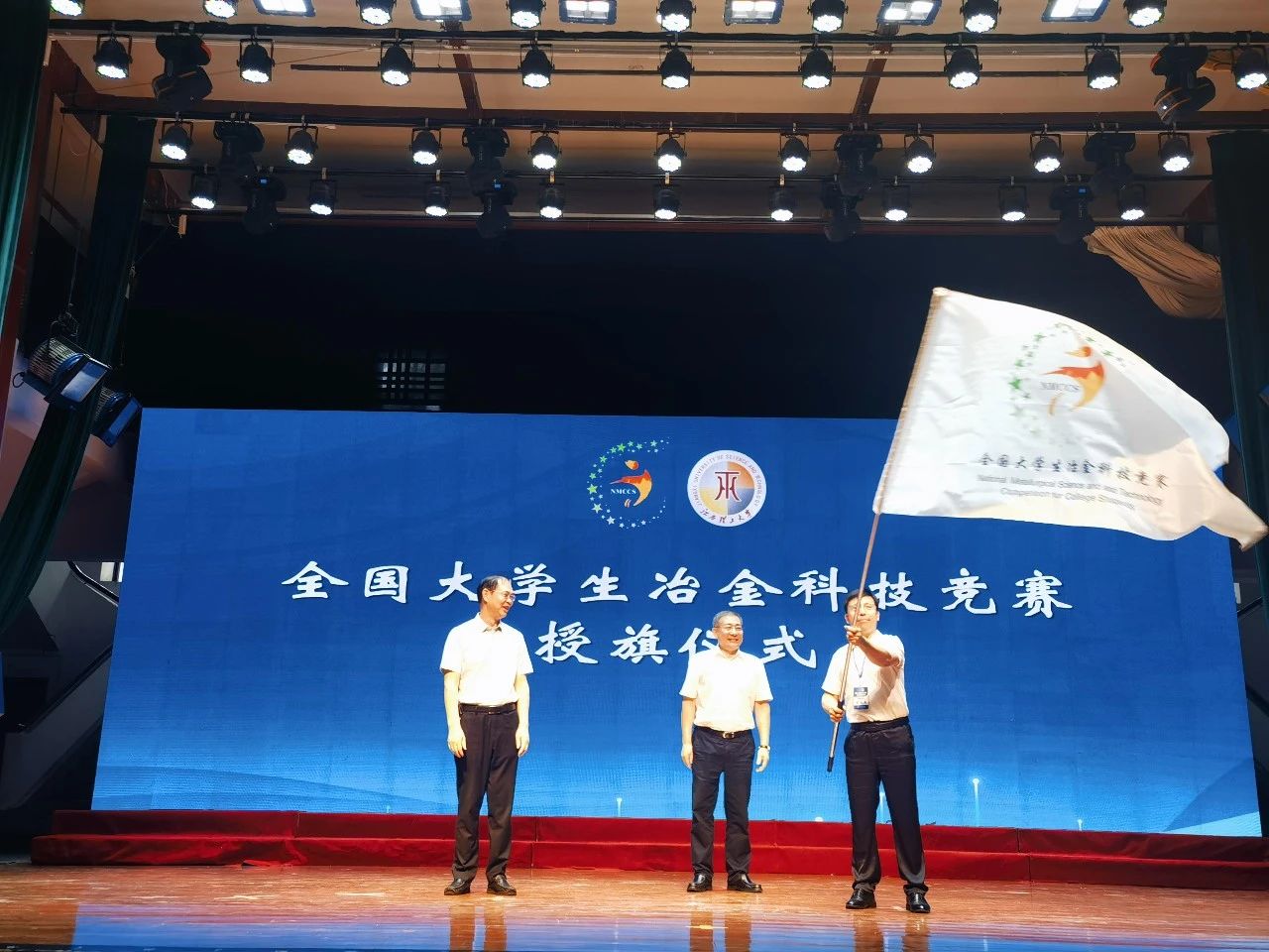 在会旗交接仪式上,江西理工大学副校长廖春发把大赛旗帜转交到中国金属学会秘书长王新江手中,再由王新江授予第八届大赛承办单位AV研究所 ,宗燕兵郑重接过了大赛旗帜。
