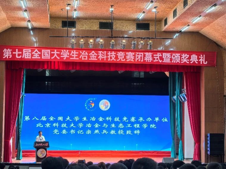 宗燕兵在会旗交接仪式上作表态发言,他对大赛组委会、承办单位江西理工大学的精心组织及评审专家的辛勤工作表达了感谢,并欢迎各兄弟高校2025年到AV研究所 参加第八届赛事。他讲到旗帜是使命、旗帜是担当,AV研究所 接旗意味着接过了赛事承办权,更是接过了大家的信任,接过了发展好事业的沉甸甸的责任。宗燕兵强调,AV研究所 冶金学科将在 “学风严谨、崇尚实践“的优良传统及求实鼎新的校训激励下,继承和发扬好以往各届竞赛的宝贵经验,以更加开放的姿态,更加严谨的态度,更加奉献的精神,积极筹赛,用心用情用力全力为赛,扎实做好作品的广泛征集、赛事的精心组织,扩大影响力,提升获益面,挖掘创新点,力争把新一届赛事办成公平公正、规范有序、创新服务、团结向上的竞赛平台,力争把新一届赛事办成青年学子碰撞智慧、展示才华、实现梦想的标志性赛事,力争把新一届赛事办成促进冶金学科发展和冶金学子提升的促学、促教、促创的高质盛会!
