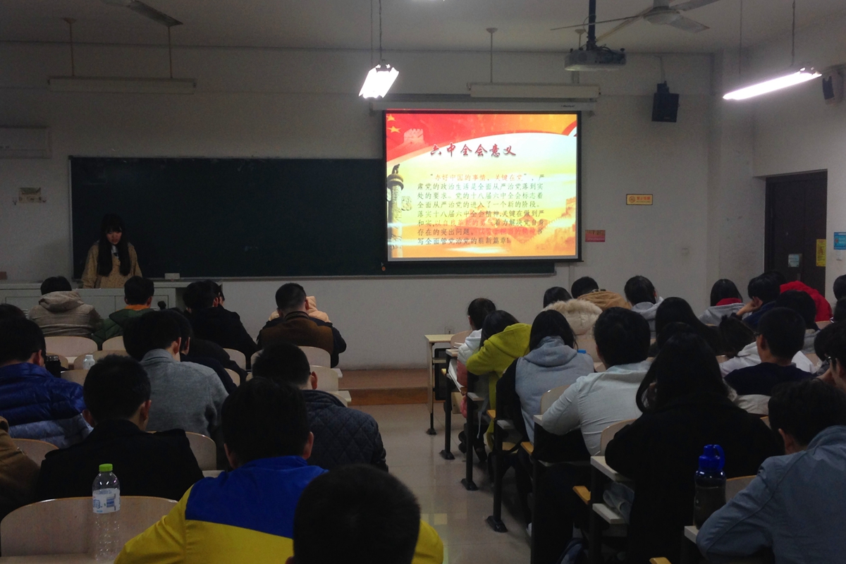 本科14级党支部于11月17日在冶金楼召开本学期第三次组织生活会学习党的十八届六中全会精神。此次组织生活会围绕十八届六中全会的主要议题“全面从严治党”开展学习交流,入党积极分子霍紫瑞和李梦娟进行主讲和分享,党支部全体成员到场参会。