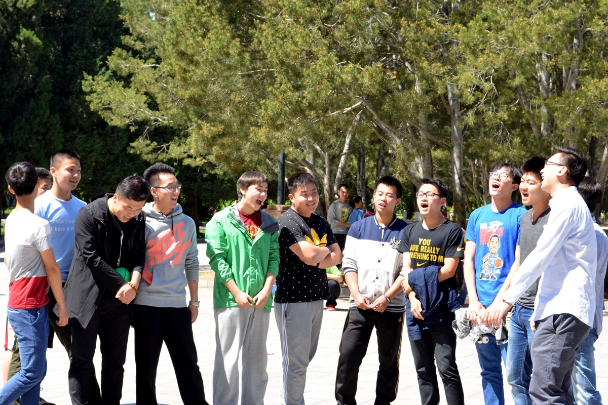 第四个游戏是“超音速”,即各组轮番跑到前方翻开扑克牌,如不能每次按照数字顺序翻出就需要下一位同学再来尝试。“工欲善其事必,先利其器”,同学们充分发挥自己工科生严谨而冷静的思维优势,不是鲁莽地拿到规则就开跑,而是各个组分别围成一个圈讨论制定策略,确保每个同学都理解了游戏规则,为制定出一个简单易行而又高效的方法同学们各尽其能,每个圈内以“超音速”完成了比赛。