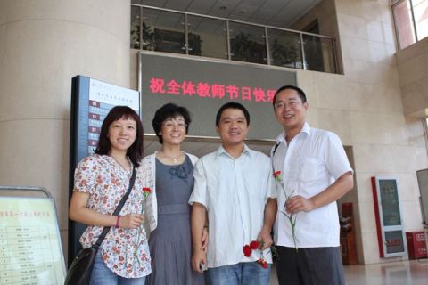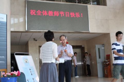 楼,为AV研究所教师亲自送上教师节的问候与祝福,在AV研究所楼一层大屏幕上显示着:祝愿全体教师节日快乐!大厅里摆放着五颜六色的鲜花康乃馨以及精美的小礼物,每当一位教师步入大厅,耿院长都亲自送上一支康乃馨和一份小礼物,感谢和笑声成为每个教师共同的语言,节日幸福灿烂的笑容洋溢在每位教师的脸上,也同时温暖着他们跳动的心房,吸引着旁边经过上课的同学及路人不时驻足观看,流露出羡慕的眼神。