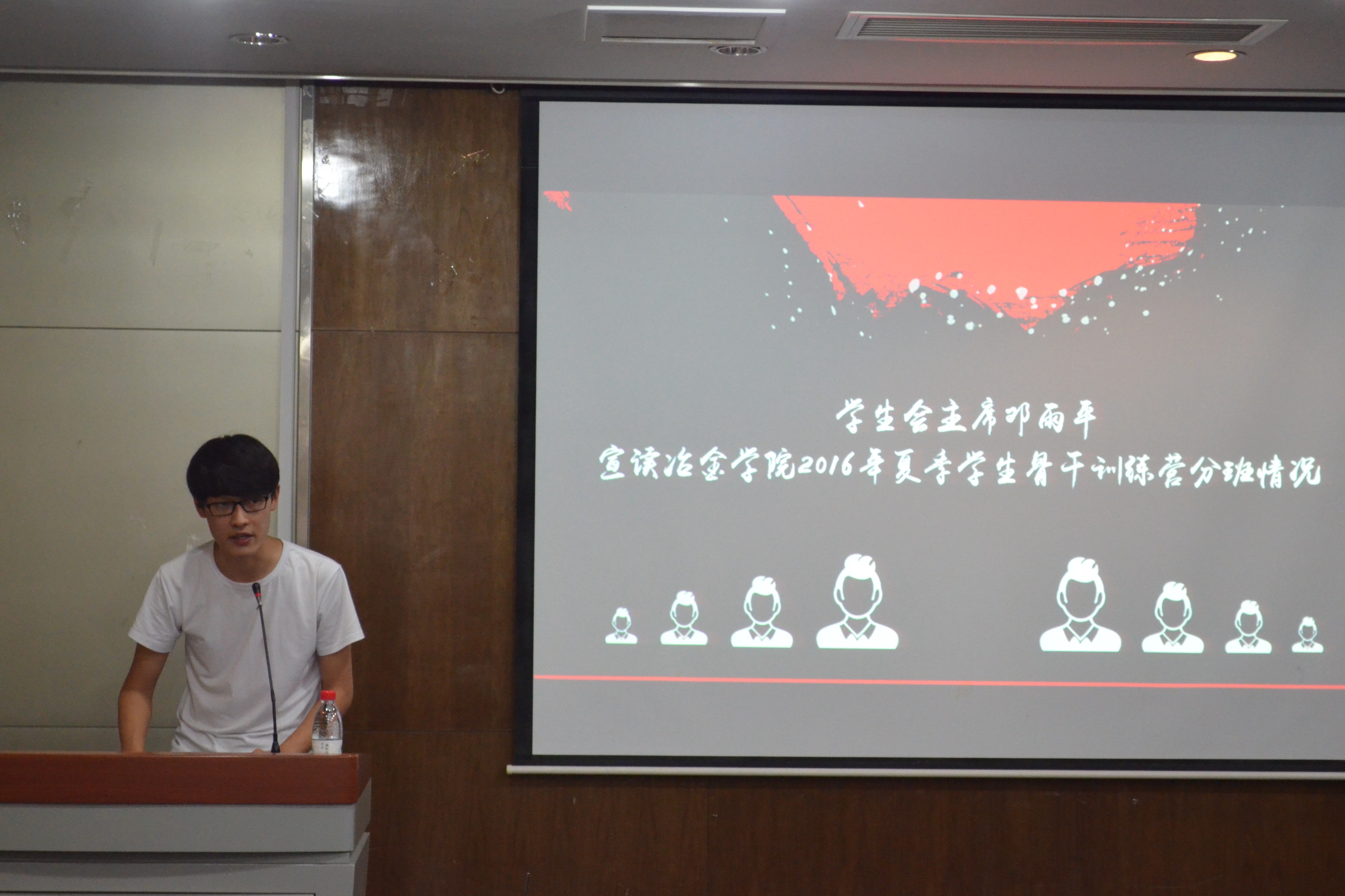 2016年夏季学生骨干训练营须知及分班情况。接下来,学员代表朱培同学代表全体学员进行发言。