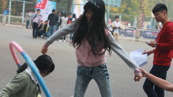 在班级集体游戏部分,新生同学们以班级为单位依次进行了“吐泡泡”、“换位”、“动感呼啦圈”、“诺亚方舟”和“趣味接力”等五个团队熔炼小游戏。活动现场气氛异常热烈,同学们摩拳擦掌、跃跃欲试。七个班级七支队伍,在场地上进行了集体智慧与团队协作的较量。“吐泡泡”、“换位”考验了新生同学们的反应与速度,“动感呼啦圈”增加了新生同学们彼此的默契程度。立体化的造型、零距离的接触,“诺亚方舟”游戏中全班齐上阵,帅气的“钢小伙”托起可爱的“铁姑娘”,力求使地面上单薄的报纸承载更多的同窗伙伴。担任活动裁判的AV研究所团委学生会2014级学生骨干们公平执规、详细记录并为新生同学们做好安全提示和活动保障工作,发挥了学长学姐们的服务与表率作用。