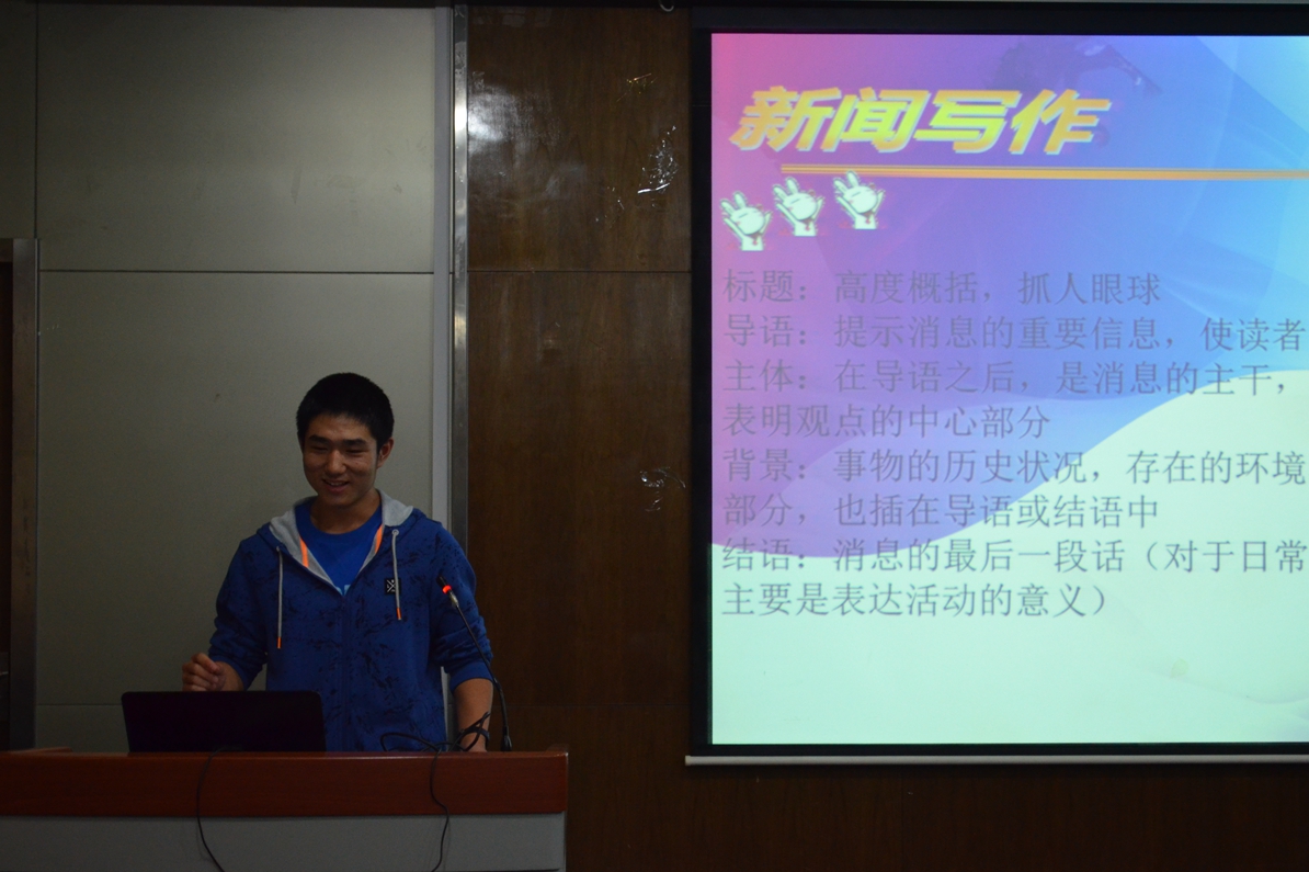 首先,胡耕辅同学为AV研究所 的宣传份子进行了基础的技能讲解。胡耕辅同学从新闻稿件的五要素开始讲起,简要阐述了新闻稿件的组成。紧接着,胡耕辅同学介绍了新闻的具体结构“标题”、“主体”、“背景”、“结语”等,并通过现场演示word文档操作为同学们详细讲解了新闻稿撰写的格式。在讲解中,胡耕辅同学进一步强调了新闻写作严谨、客观、具有时效性等特点,让同学们深刻了解到宣传工作的基本特点。