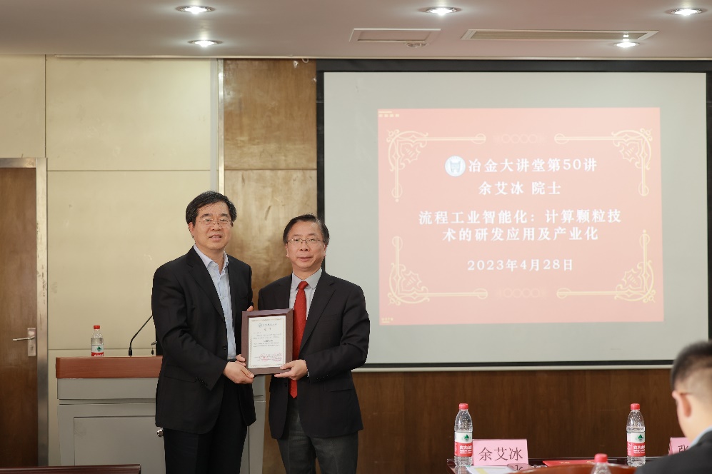报告结束后,余院士和在场师生就机器学习、仿真技术的实际应用等问题展开了细致深入的交流。最后,张建良院长为余艾冰院士颁发了冶金大讲堂的纪念证书,学术交流活动圆满结束。