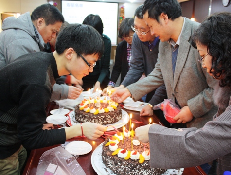 2012年是龙年,活动伊始AV研究所工会特地为属龙的教师们准备了精美的礼品,订制了美味的生日蛋糕,由工会主席王新东老师宣读寿星名单。在“祝你生日快乐”的乐曲中,属龙的老师们许下心愿,吹灭蜡烛,与在场的所有老师们分享了生日大蛋糕。