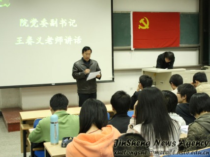 随后,院党委副书记王春义老师发表了讲话。他要求所有的入党积极分子必须秉承“学风严谨,崇尚实践”的优良学风,刻苦学习,积极进取,求实创新,力争成为合格的优秀党员,成为党的新一代接班人。