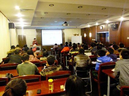 活动当天,邱桂博同学首先用诙谐幽默的语言,介绍了PPT是在特定条件下的一种高效的交流工具,并指出PPT最重要的不是动画效果,而是在不同场合下选择合适的主题形式,他还强调PPT在内容的排版上一定要简洁、清晰和新颖。随后,他又向同学们讲解了做PPT可能遇到的问题以及解决它们的方法,内容包括为什么做好的PPT字体总变化、为什么PPT模板上有的字删不掉、如何做漂亮的彩色底板和边框以及如何实现PPT里面图片的多样化等等。接着,他从文字动画、图形动画、转场动画三个方面,向同学们讲述了如何在PPT中实现漂亮的动画效果,并让同学们欣赏了几部优秀的参赛作品。最后在互动环节,他还一一解答了大家在PPT制作过程中所遇到的问题,整个活动一直都处在轻松愉悦的氛围中。