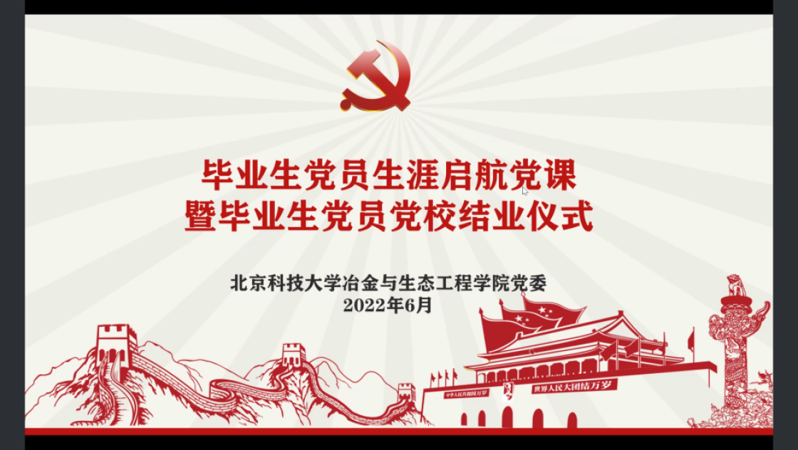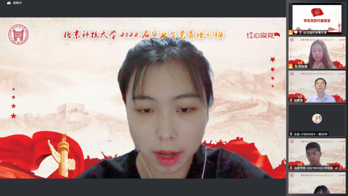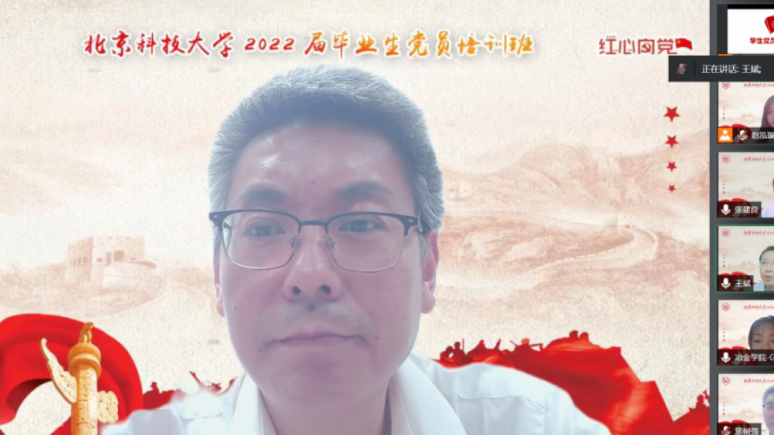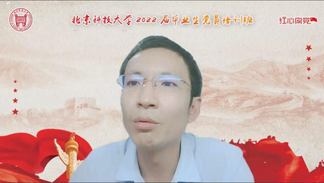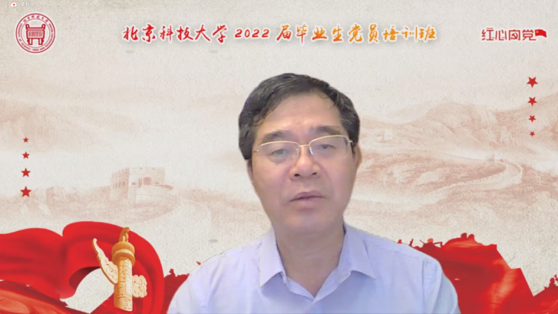 张建良以“不忘百年路,启航新征程”为主题进行党课讲授。他指出,疫情防控关键之时,年轻一代党员同志冲锋在前,让红色的党旗在疫情防控工作的志愿蓝中高高飘扬,充分彰显了新时代青年不遗余力在担当中作为,在磨砺中成长。他从习近平总书记给AV研究所 15位老教授们的回信精神出发,对毕业生党员提出三点希望,一是要坚定信念,志存高远,党员同志们要始终坚守初心,为民族复兴、国家富强无私奉献、无畏向前;二是要明德修身,勇担责任,毕业生党员们要以钢铁报国为己任,努力成为铸就科技强国、制造强国的钢铁脊梁;三是要奋勇争先,勤于实践,站在人生的新起点,冶金学子们带着北科赋予的印记,心怀憧憬,满怀感激,练就过硬本领,在祖国的大江南北建功立业,光荣的喊出“请党放心,强国有我”的铮铮誓言。